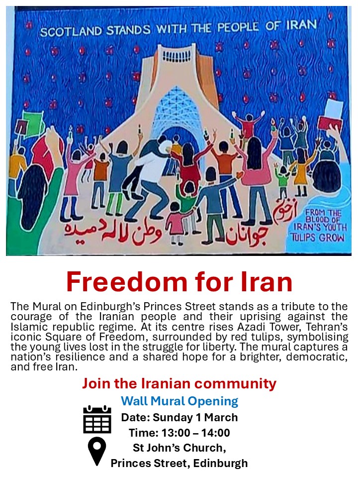 Today, a powerful mural on Edinburgh’s Princes Street stands as a tribute to the courage of the Iranian people. At its centre rises Azadi Tower, Tehran’s iconic Square of Freedom, surrounded by red tulips, symbolising the young lives lost in the struggle for liberty.